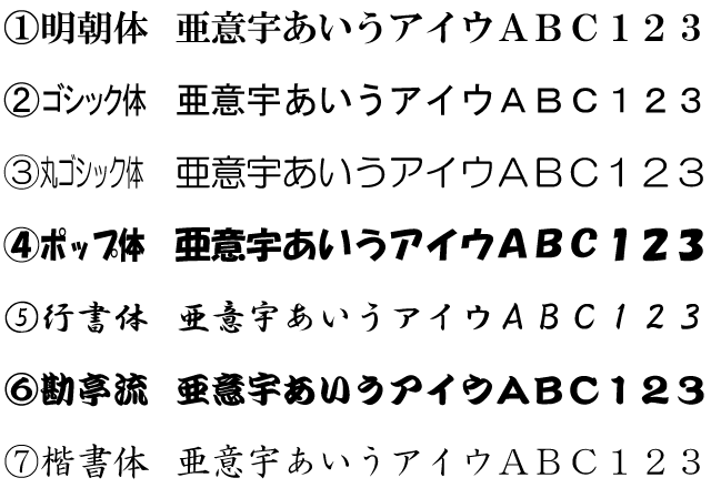 以下よりお選びください。特殊文字、ロゴ等ご使用の場合は、メールにてデータをお送りください。